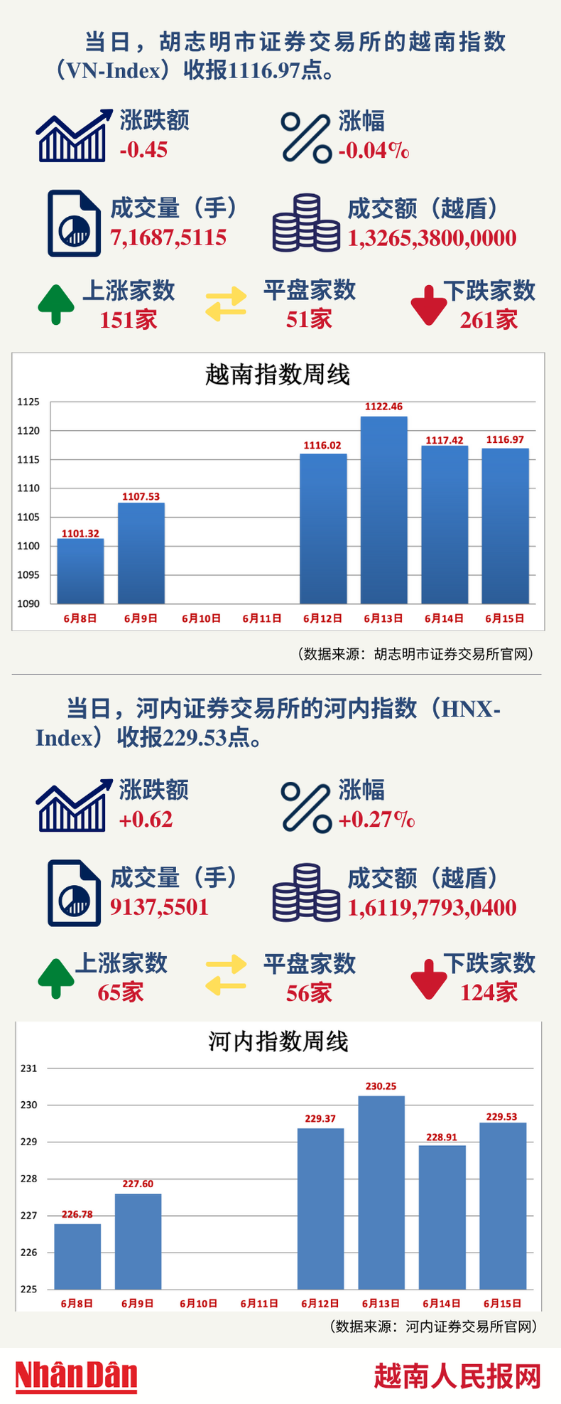 当天,胡志明市证券交易所的越南指数(VN-Index)和河内证券交易所的河内指数(HNX-Index)分别收报1116.97点和229.53点。