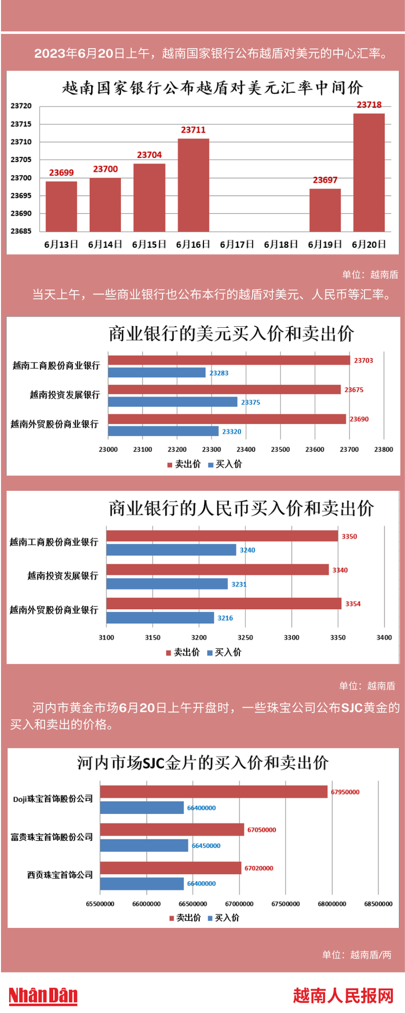 2023年6月20日上午,越南国家银行所公布的越盾对美元的中心汇率为23718。