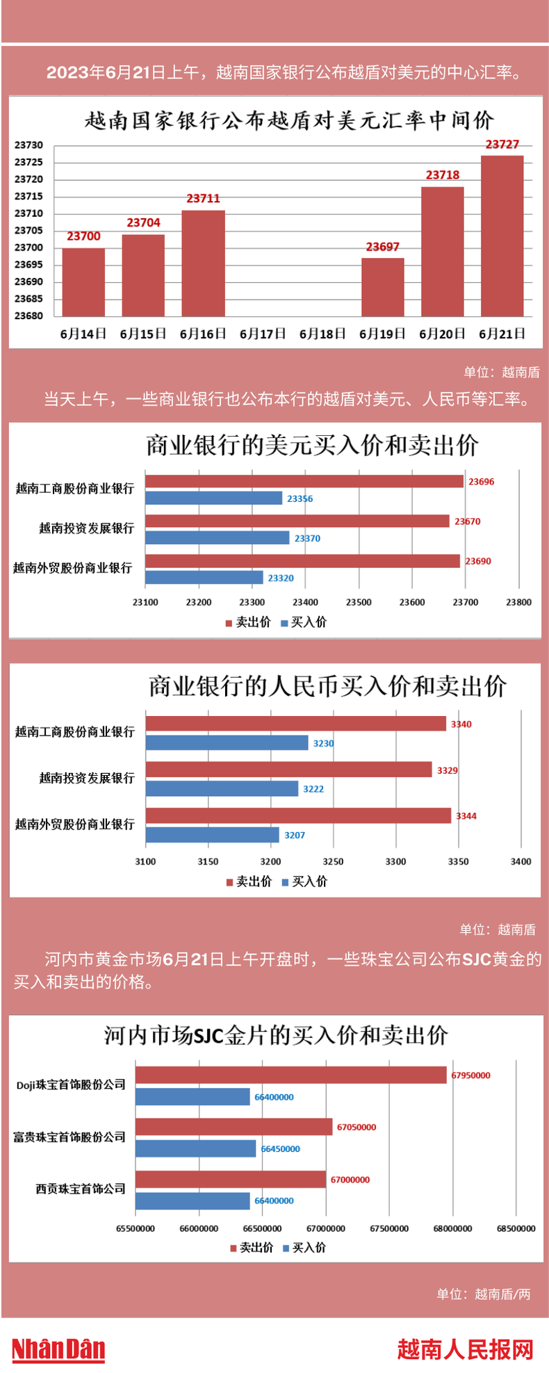 2023年6月21日上午,越南国家银行所公布的越盾对美元的中心汇率为23727。