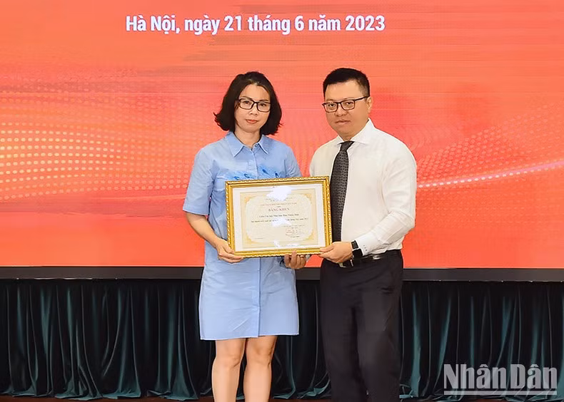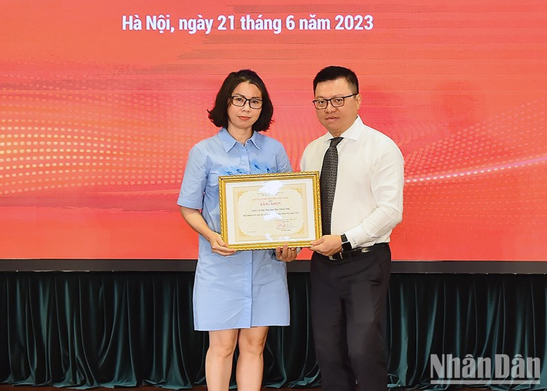 | 《人民报》社总编辑黎国明向《人民报》社工会优秀干部、会员颁发越南公务员工会2022年度面孔奖。 |