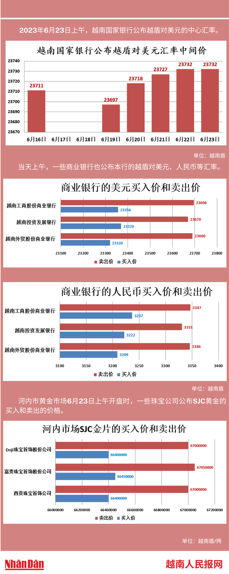 2023年6月23日上午,越南国家银行所公布的越盾对美元的中心汇率为23732。