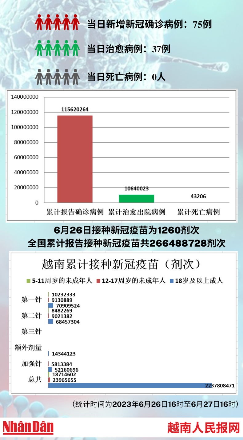 据越南卫生部6月27日下午公布的信息,当天越南新增新冠肺炎确诊病例为75例,治愈病例37,无死亡病例。