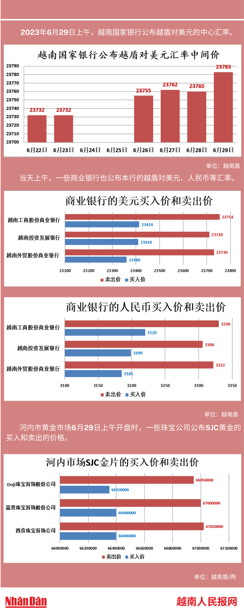 2023年6月29日上午,越南国家银行所公布的越盾对美元的中心汇率为23783。