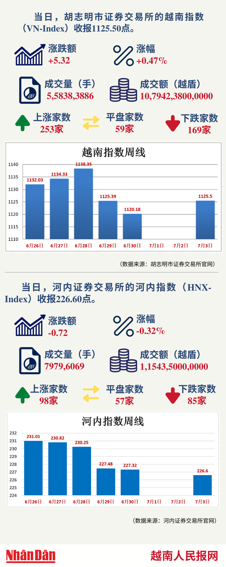 当天,胡志明市证券交易所的越南指数(VN-Index)和河内证券交易所的河内指数(HNX-Index)分别收报1125.5点和226.6点。