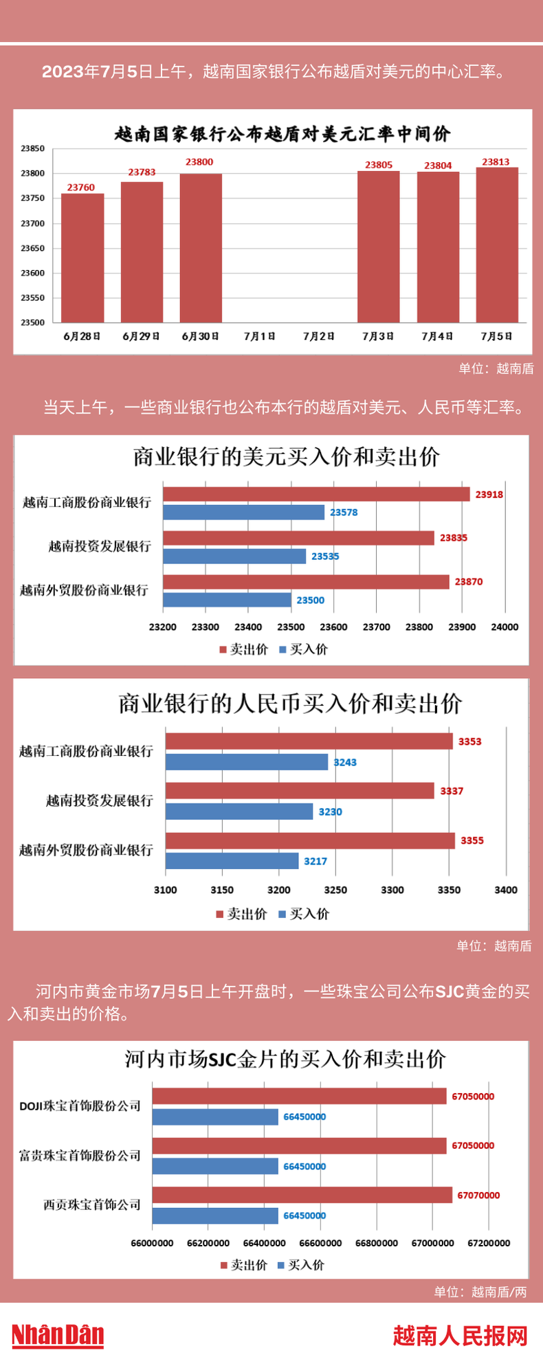 2023年7月4日上午,越南国家银行所公布的越盾对美元的中心汇率为23813。