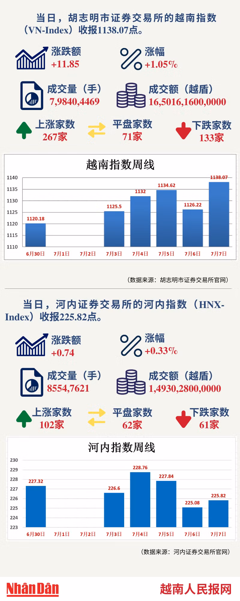 当天,胡志明市证券交易所的越南指数(VN-Index)和河内证券交易所的河内指数(HNX-Index)分别收报1138.07点和225.82点。