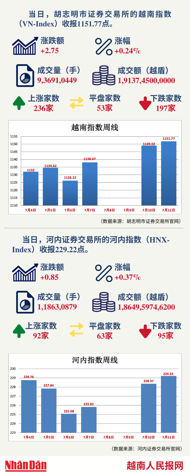 当天,胡志明市证券交易所的越南指数(VN-Index)和河内证券交易所的河内指数(HNX-Index)分别收报1151.77点和228.37点。