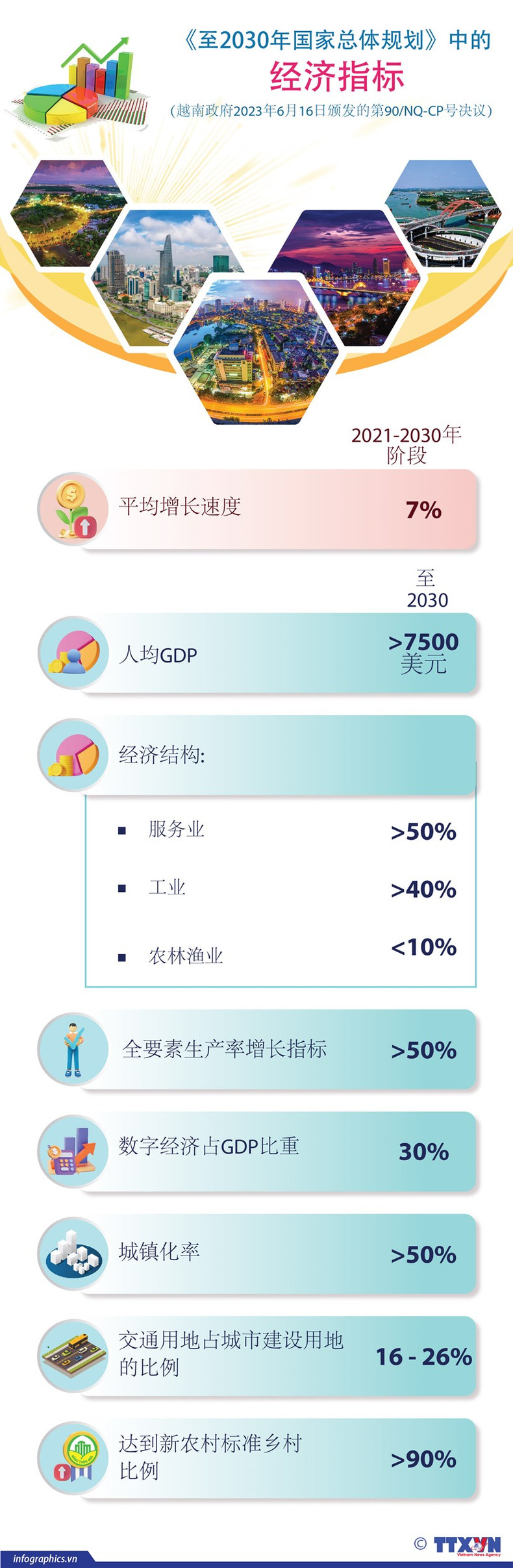 根据政府关于落实2021-2030年阶段,愿景展望至2050年的国家总体规划的行动计划,2021-2030年阶段,全国年均GDP增速约达7%,到2030年,按现价计算的人均GDP将达7500美元左右。