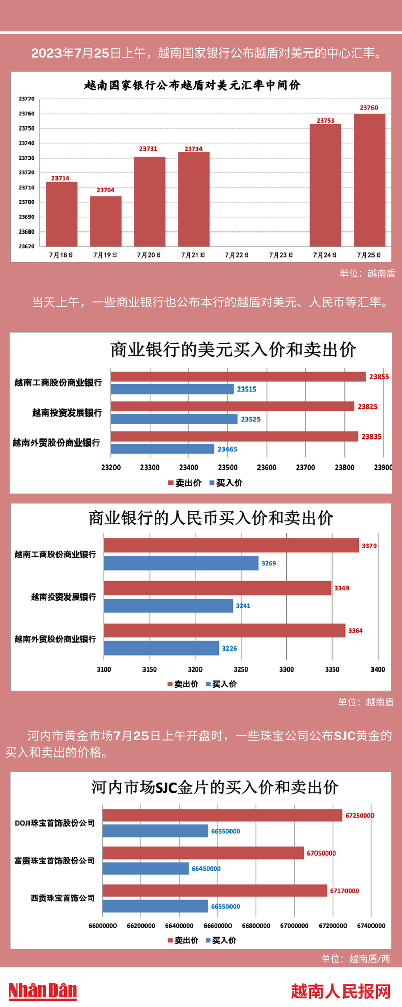 2023年7月25日上午,越南国家银行所公布的越盾对美元的中心汇率为23760。