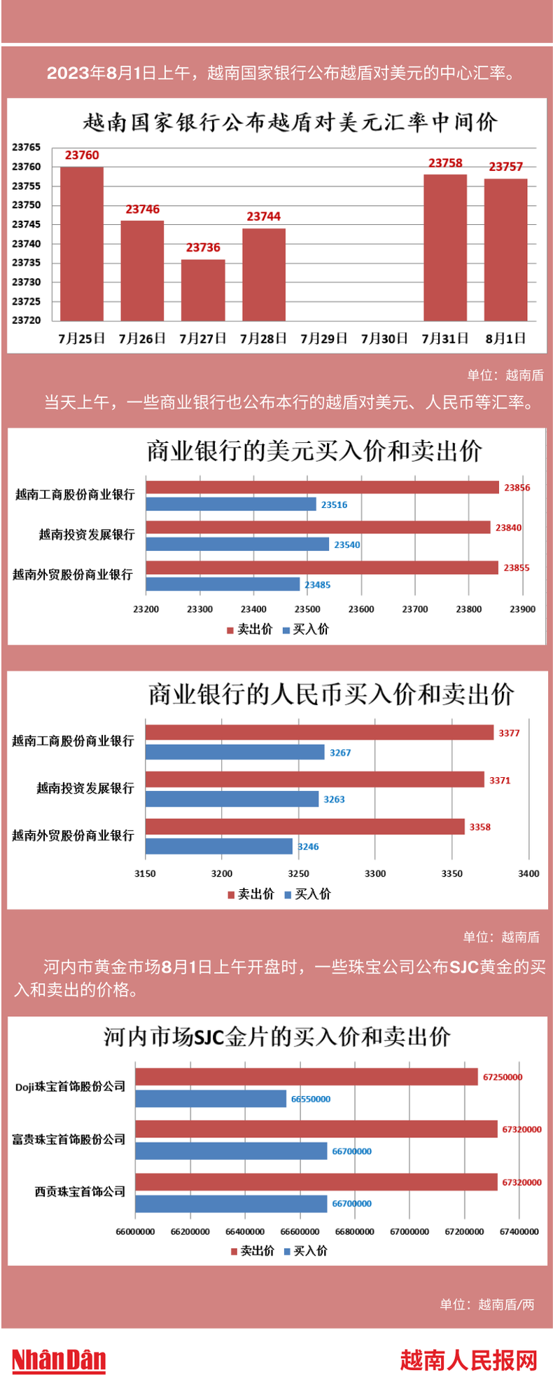 2023年7月31日上午,越南国家银行所公布的越盾对美元的中心汇率为23757。