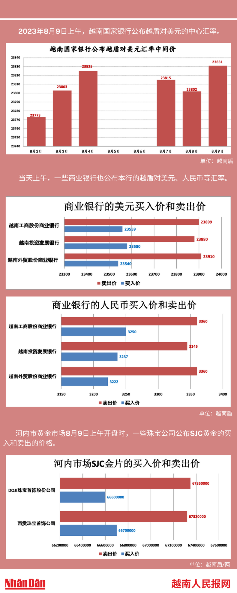 2023年8月9日上午,越南国家银行所公布的越盾对美元的中心汇率为23831。