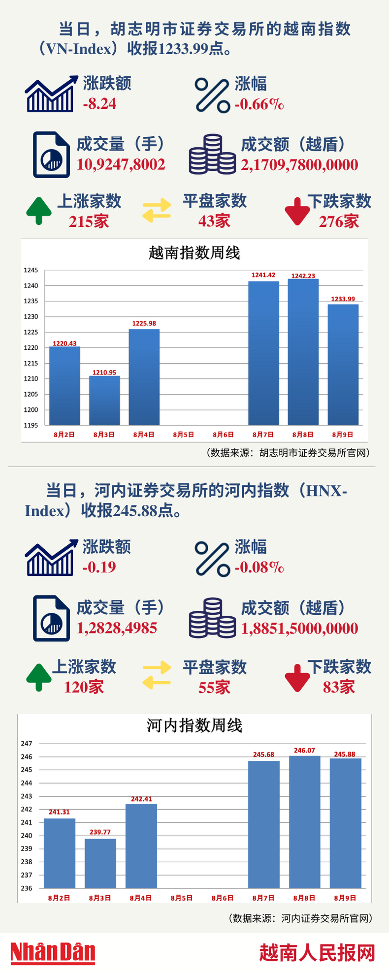 当天,胡志明市证券交易所的越南指数(VN-Index)和河内证券交易所的河内指数(HNX-Index)分别收报1233.99点和245.88点。