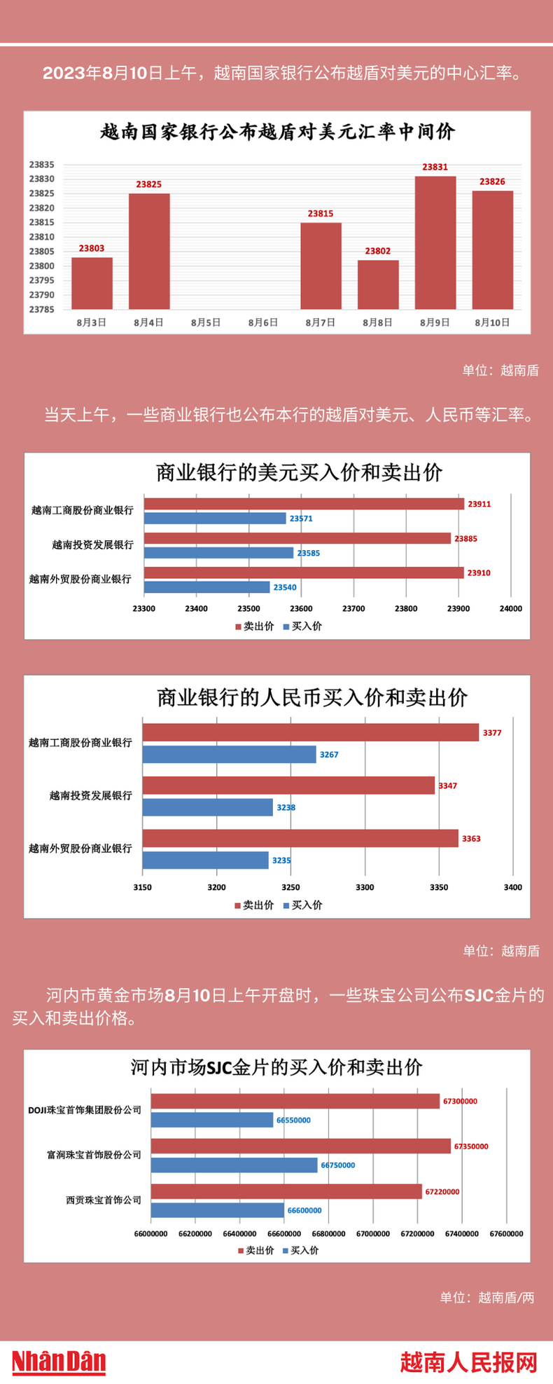 2023年8月10日上午,越南国家银行所公布的越盾对美元的中心汇率为23826。
