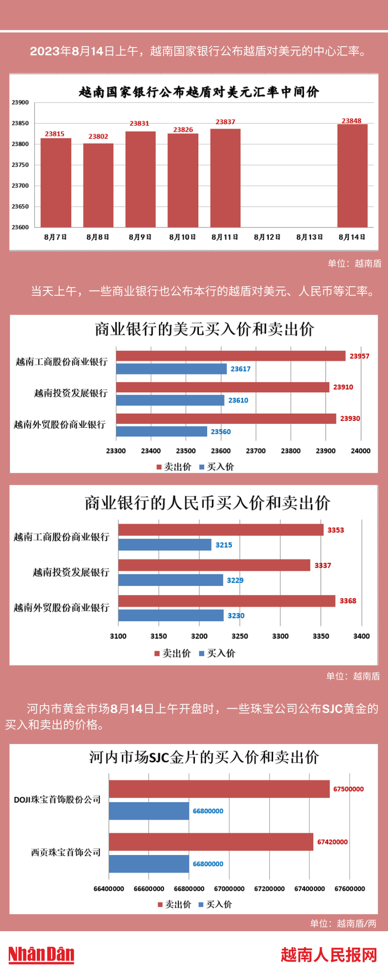 2023年8月14日上午,越南国家银行所公布的越盾对美元的中心汇率为23848。