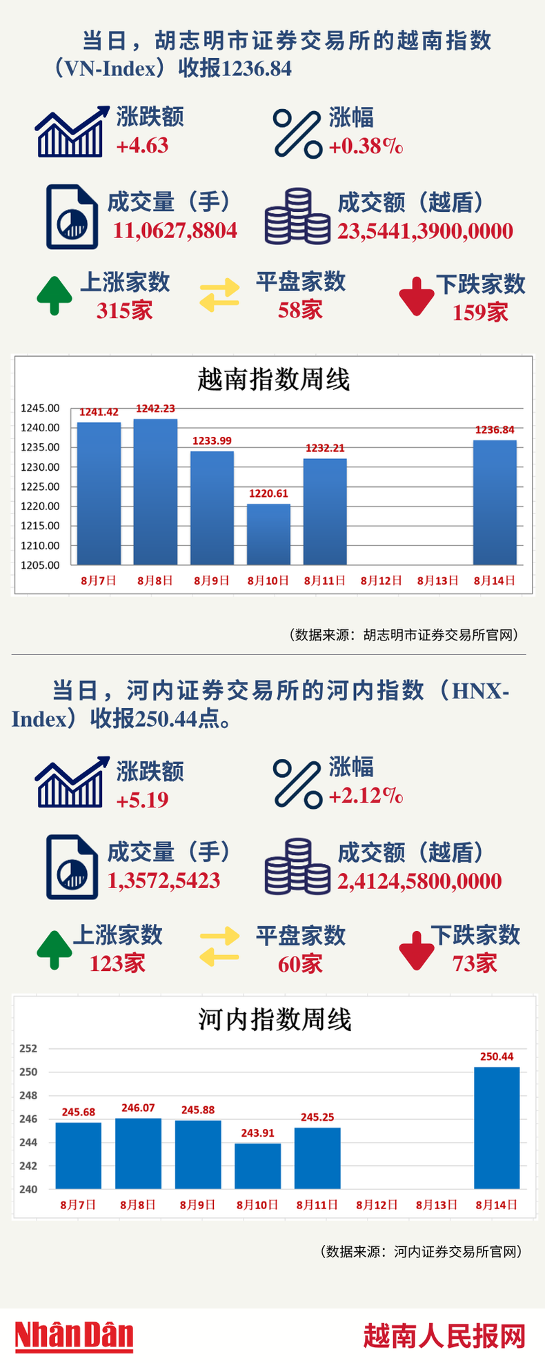 当天,胡志明市证券交易所的越南指数(VN-Index)和河内证券交易所的河内指数(HNX-Index)分别收报1236.84点和250.44点。