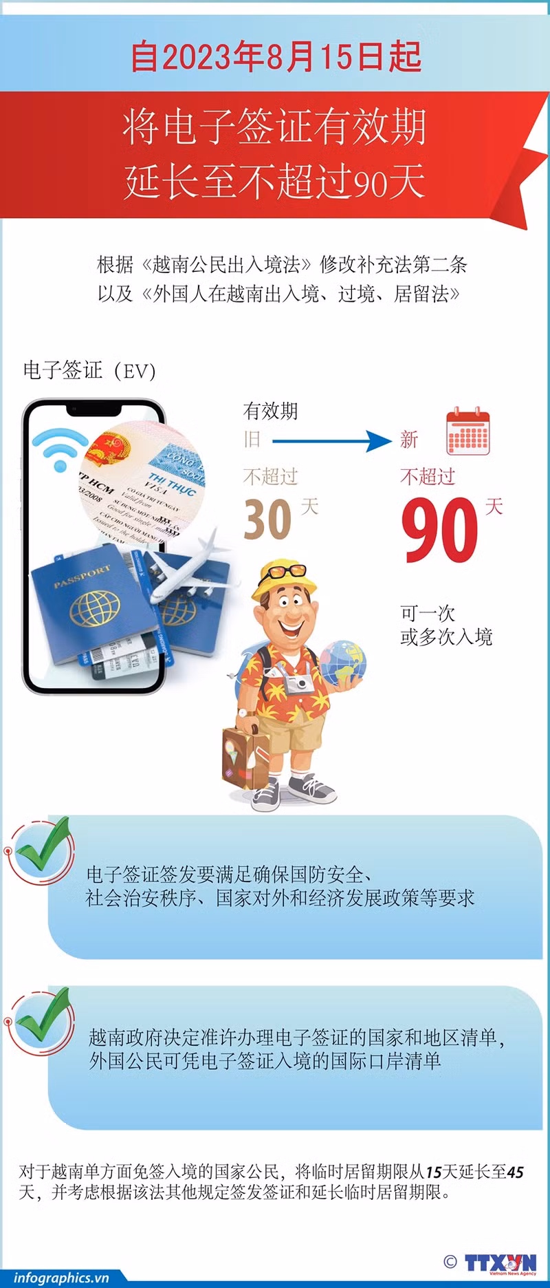 根据《越南公民出入境法》修改补充法第二条以及《外国人在越南出入境、过境、居留法》,自2023年8月15日起将电子签证有效期延长至不超过90天。