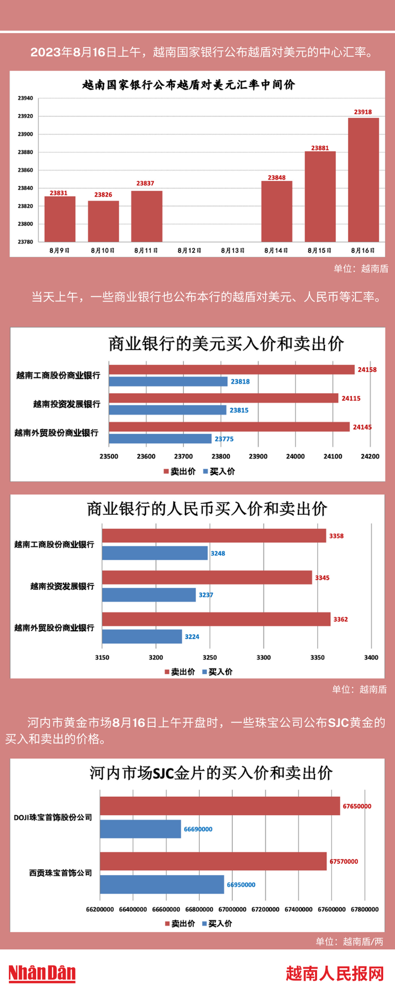 2023年8月16日上午,越南国家银行所公布的越盾对美元的中心汇率为23918。