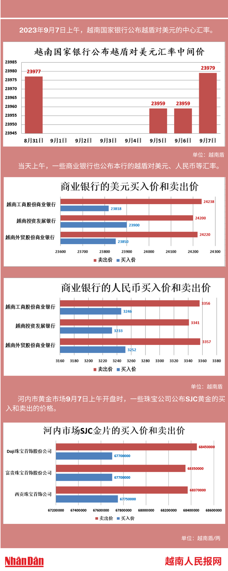 2023年9月7日上午,越南国家银行所公布的越盾对美元的中心汇率为23979。