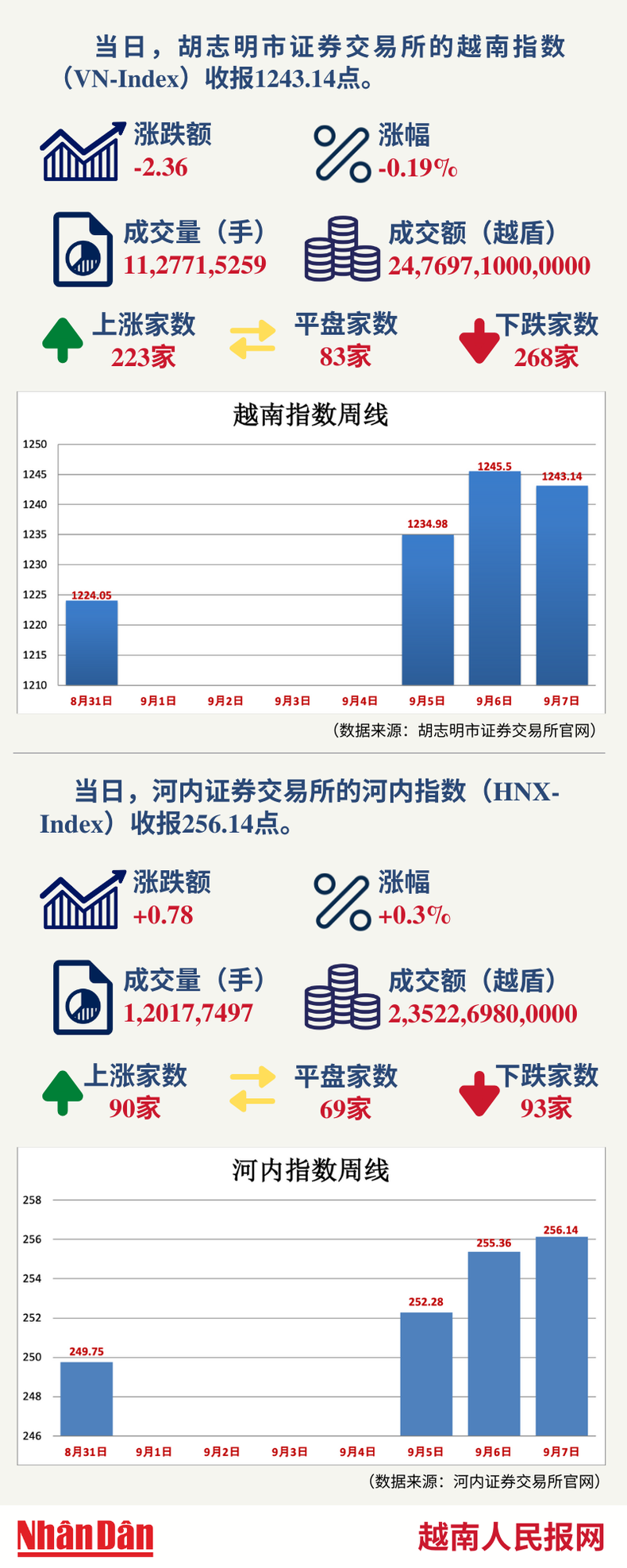 当天,胡志明市证券交易所的越南指数(VN-Index)和河内证券交易所的河内指数(HNX-Index)分别收报1243.14点和256.14点。