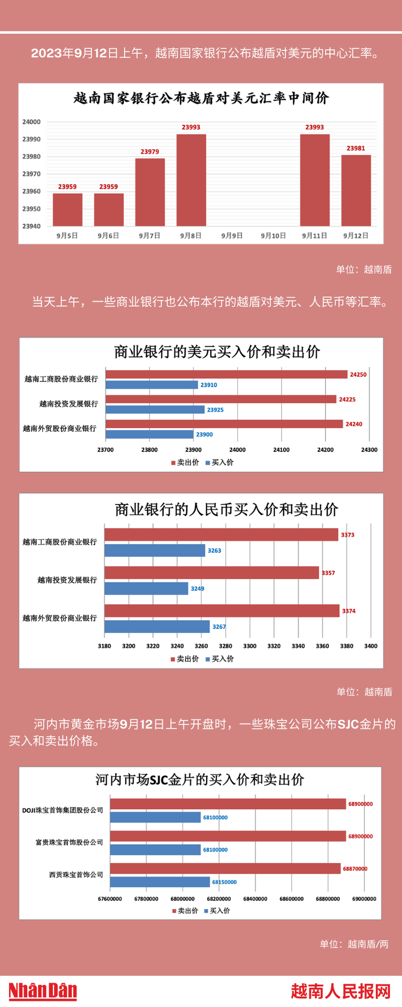 2023年9月12日上午,越南国家银行所公布的越盾对美元的中心汇率为23981。