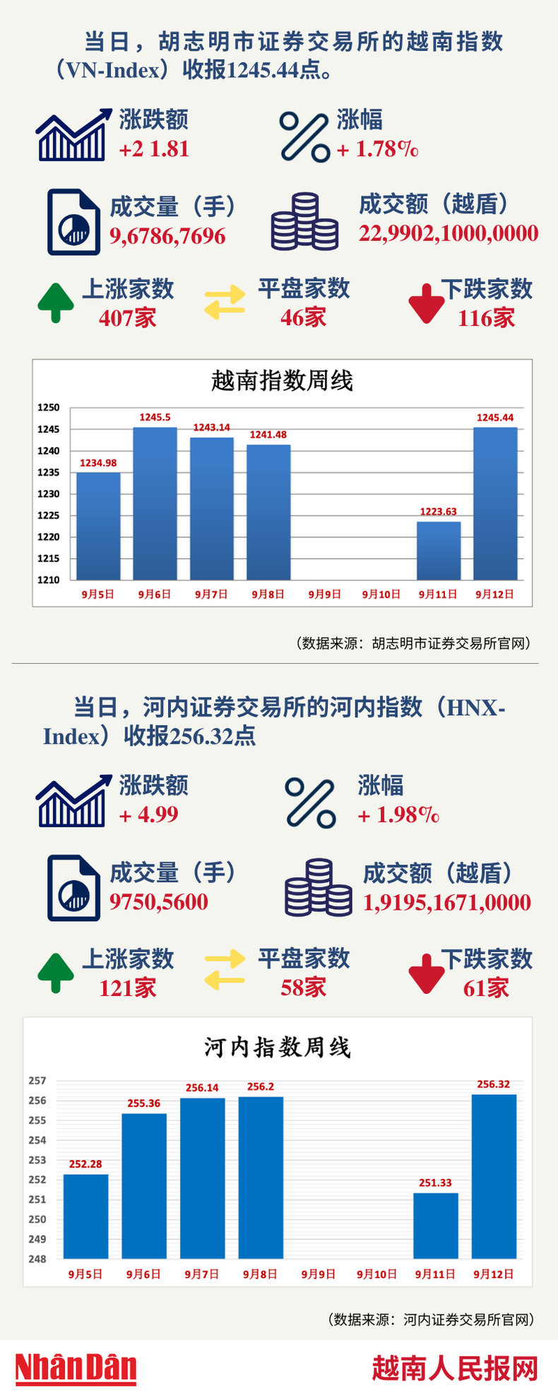 当天,胡志明市证券交易所的越南指数(VN-Index)和河内证券交易所的河内指数(HNX-Index)分别收报1245.44点和256.32点。