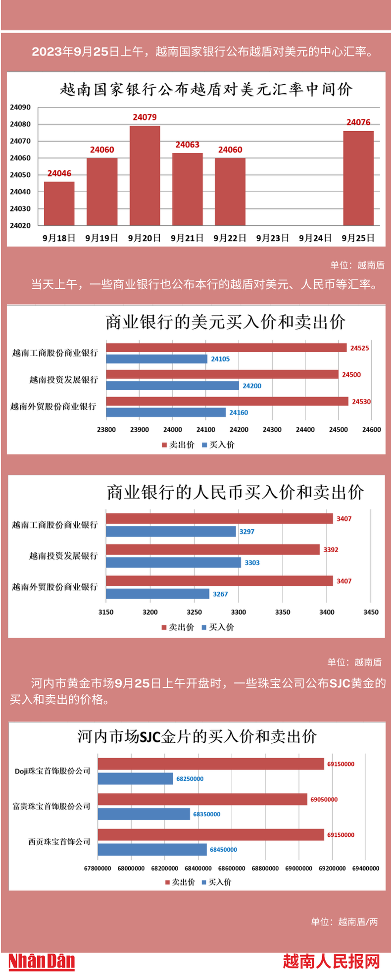 2023年9月25日上午,越南国家银行所公布的越盾对美元的中心汇率为24076。