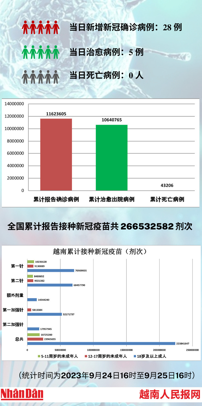 据越南卫生部9月25日下午公布的信息,当天越南新增新冠肺炎确诊病例为28例,治愈病例5,无死亡病例。