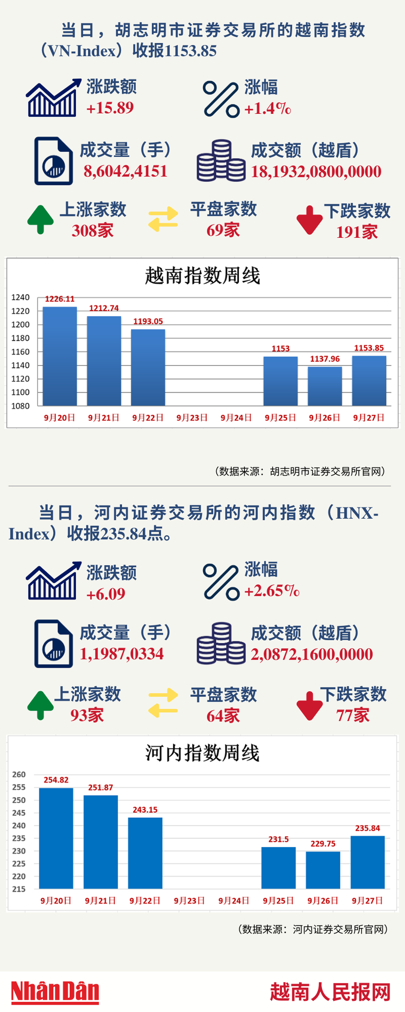 当天,胡志明市证券交易所的越南指数(VN-Index)和河内证券交易所的河内指数(HNX-Index)分别收报1153.85点和235.84点。