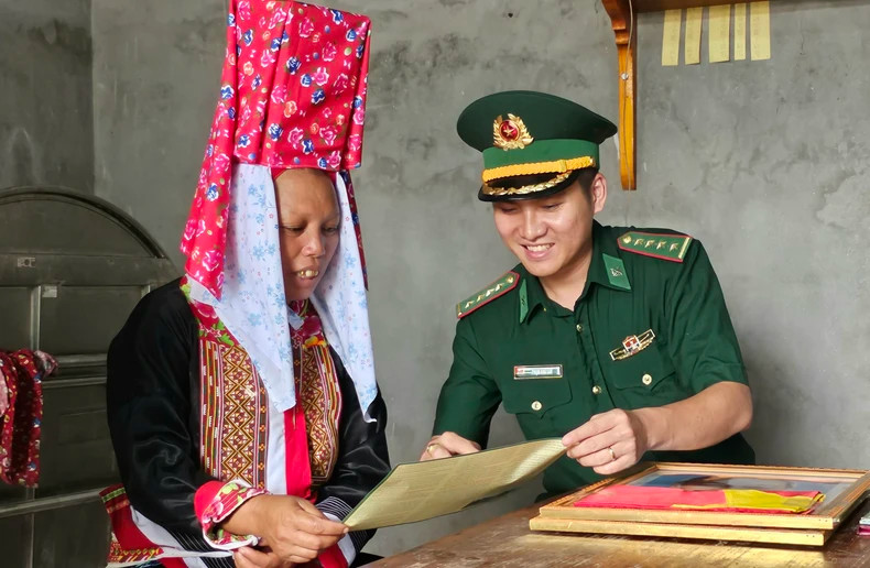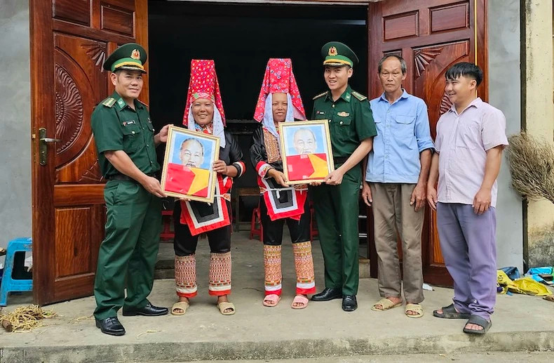 | 横模口岸边防屯干部战士向当地人民赠送胡伯伯的照片和越南国旗。 |