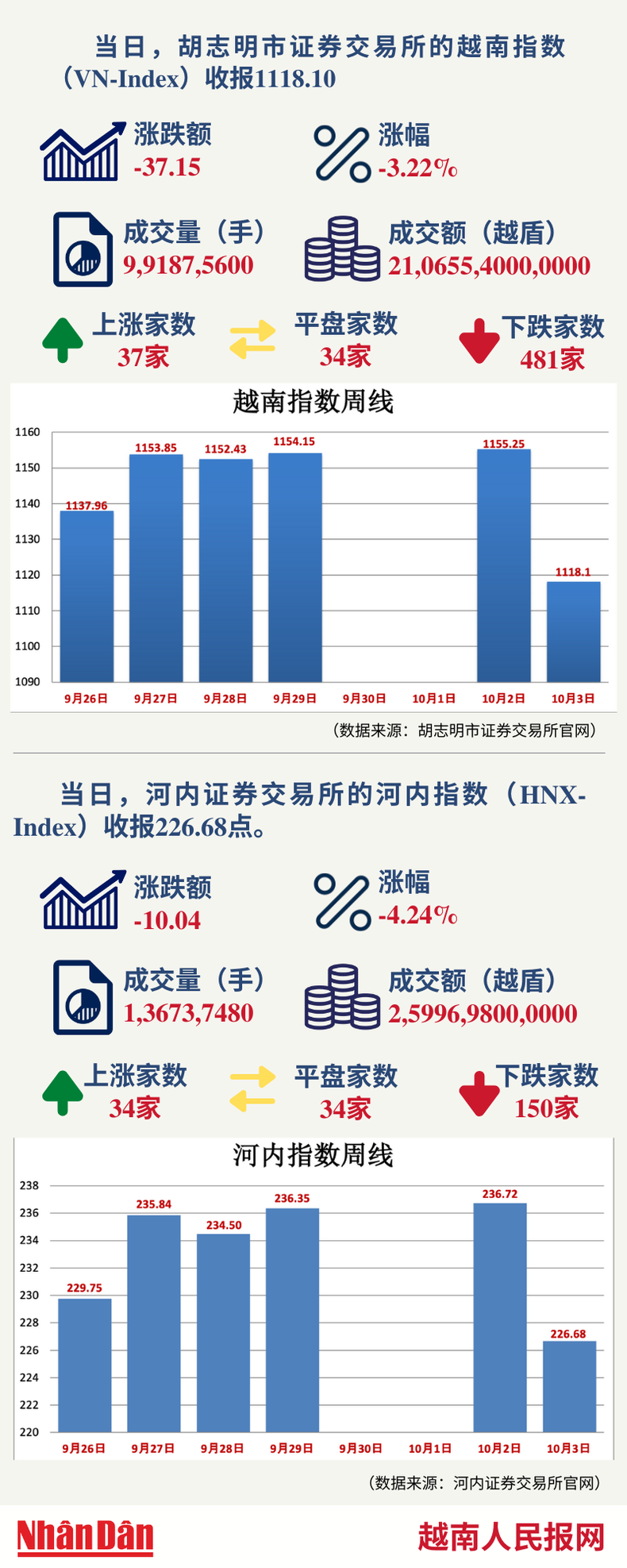 当天,胡志明市证券交易所的越南指数(VN-Index)和河内证券交易所的河内指数(HNX-Index)分别收报1118.10点和226.68点。