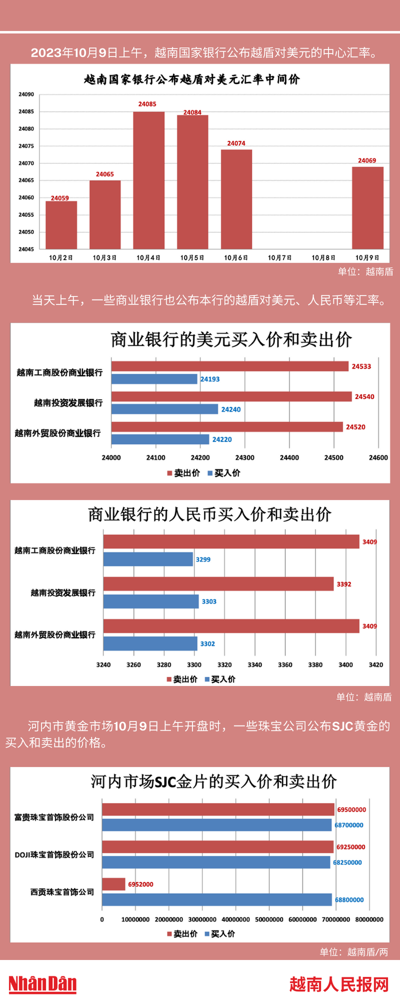 2023年10月9日上午,越南国家银行所公布的越盾对美元的中心汇率为24069。