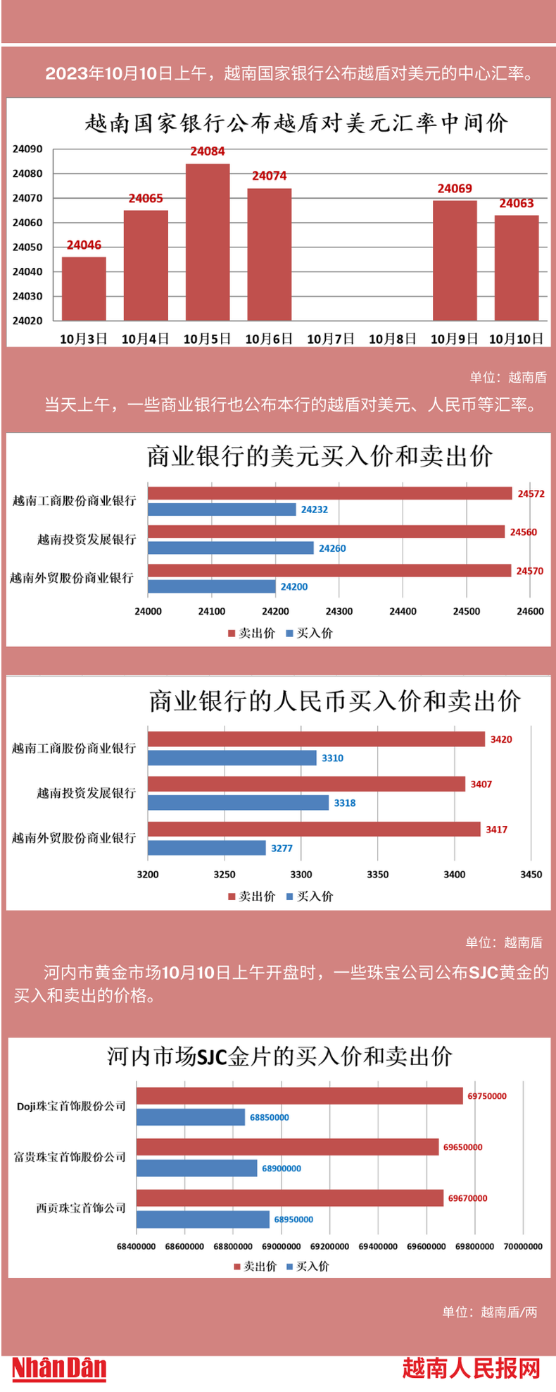 2023年10月10日上午,越南国家银行所公布的越盾对美元的中心汇率为24069。