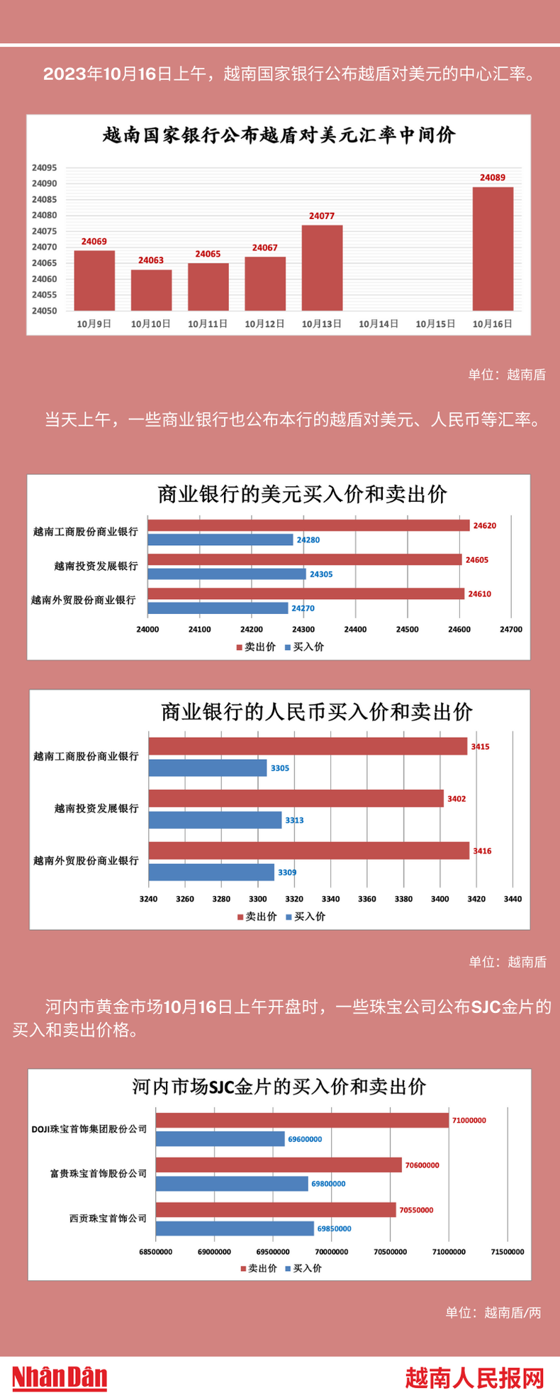 2023年10月16日上午,越南国家银行所公布的越盾对美元的中心汇率为24089。