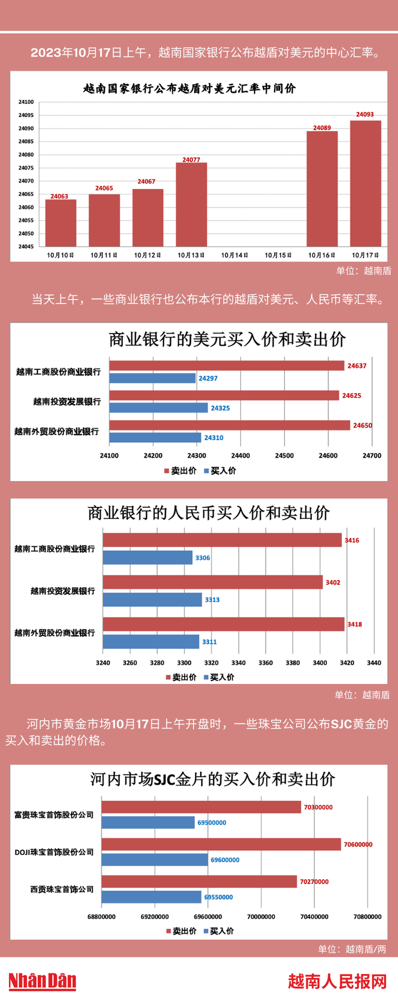 2023年10月17日上午,越南国家银行所公布的越盾对美元的中心汇率为24093。