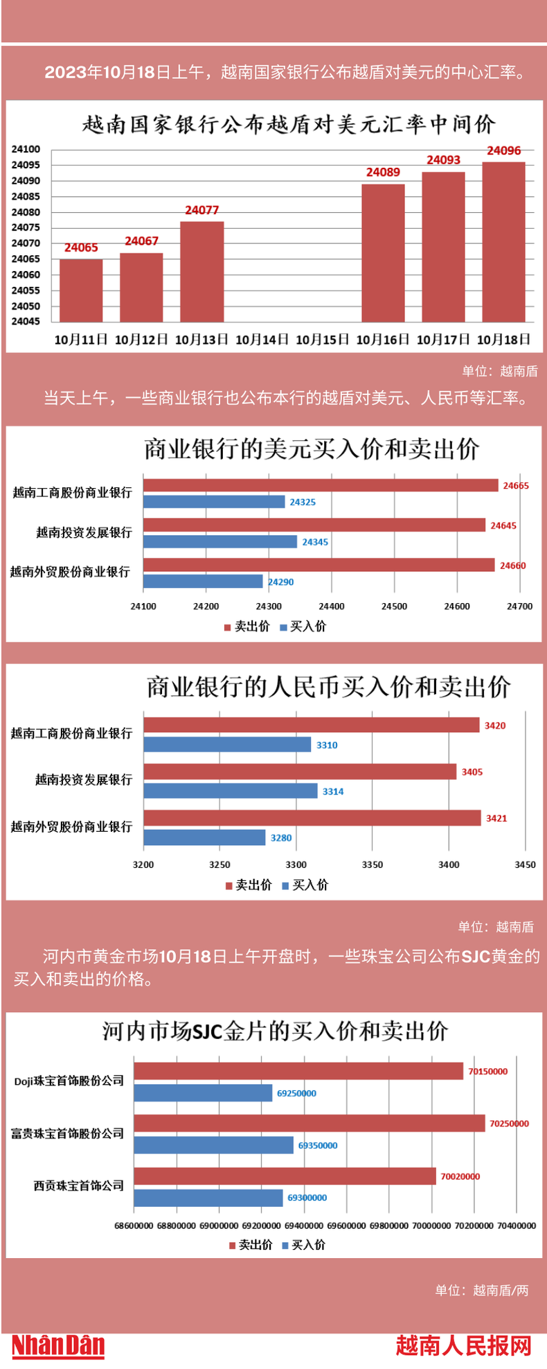 2023年10月18日上午,越南国家银行所公布的越盾对美元的中心汇率为24。