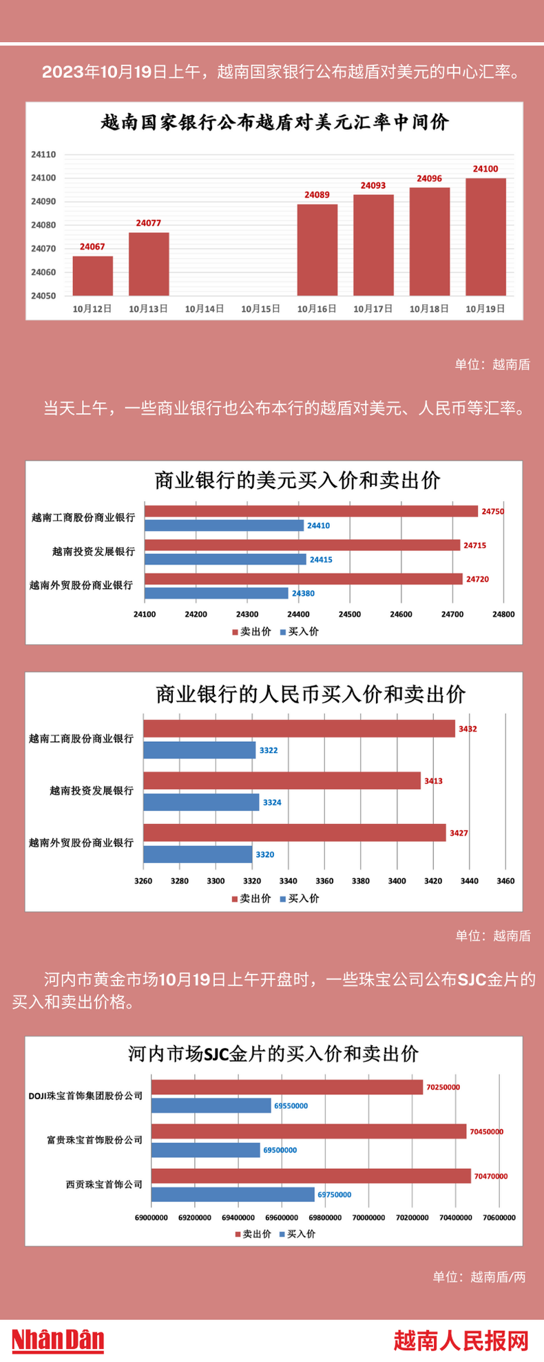 2023年10月19日上午,越南国家银行所公布的越盾对美元的中心汇率为24100。