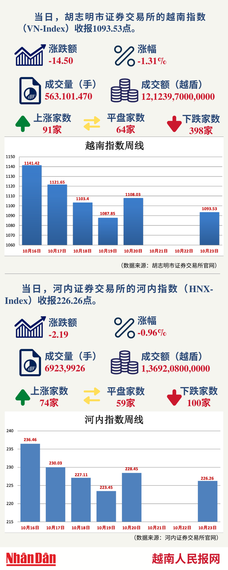 当天,胡志明市证券交易所的越南指数(VN-Index)和河内证券交易所的河内指数(HNX-Index)分别收报1093.53点和226.26点。