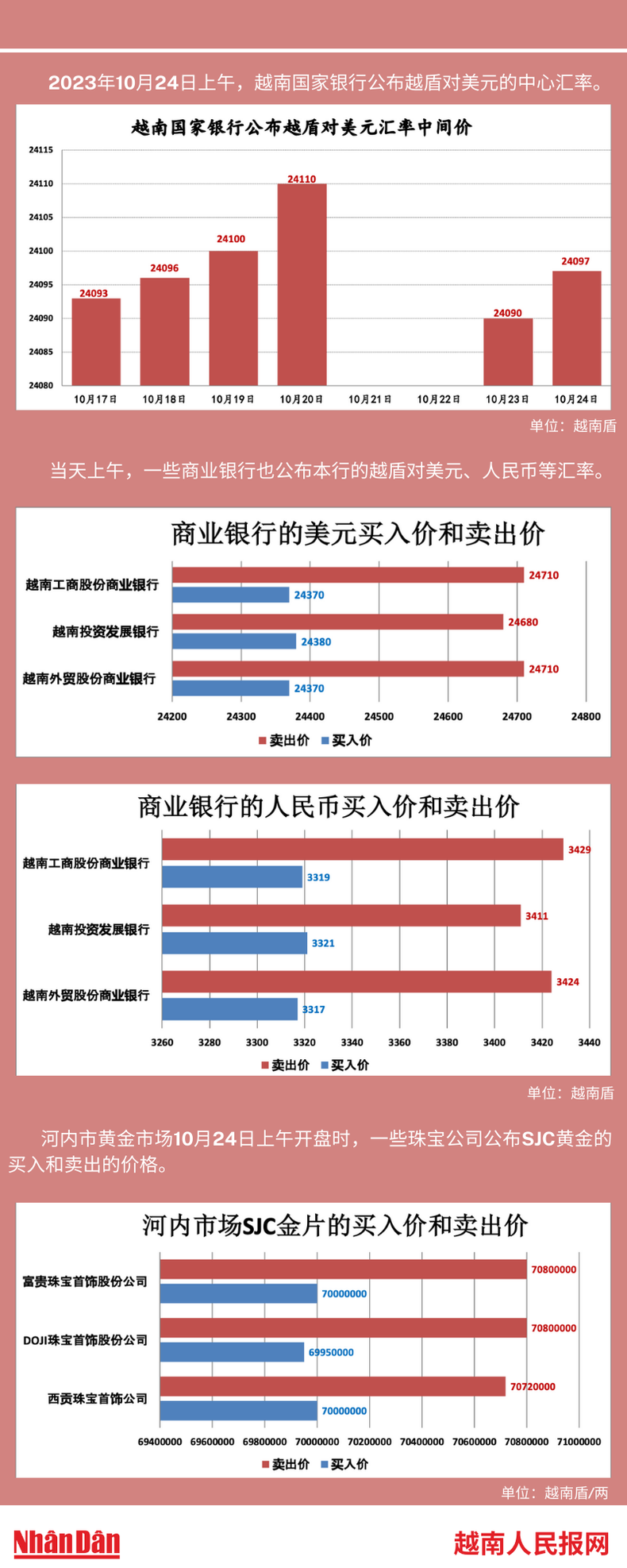 2023年10月24日上午,越南国家银行所公布的越盾对美元的中心汇率为24097。