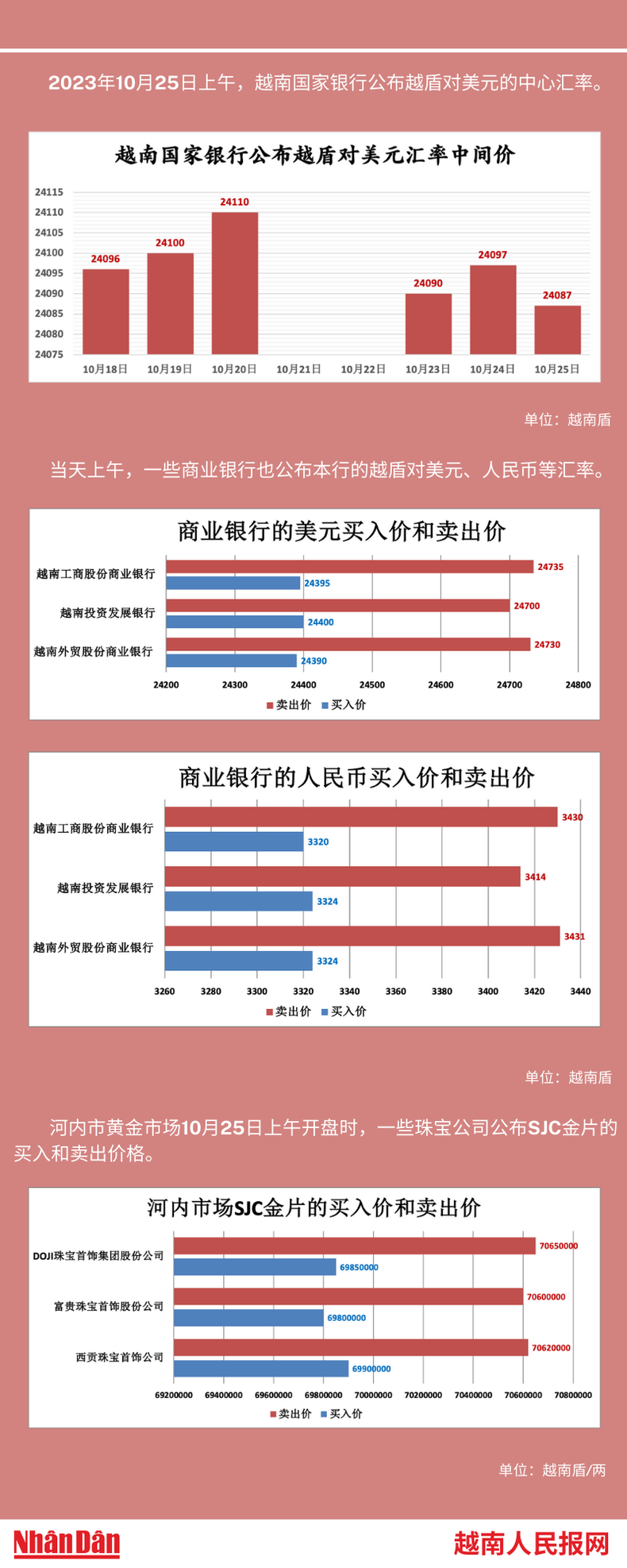 2023年10月25日上午,越南国家银行所公布的越盾对美元的中心汇率为24087。