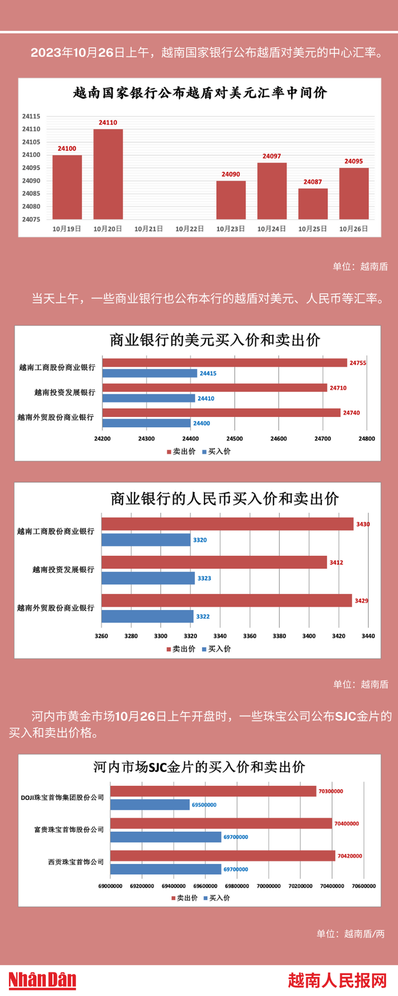 2023年10月26日上午,越南国家银行所公布的越盾对美元的中心汇率为24095。