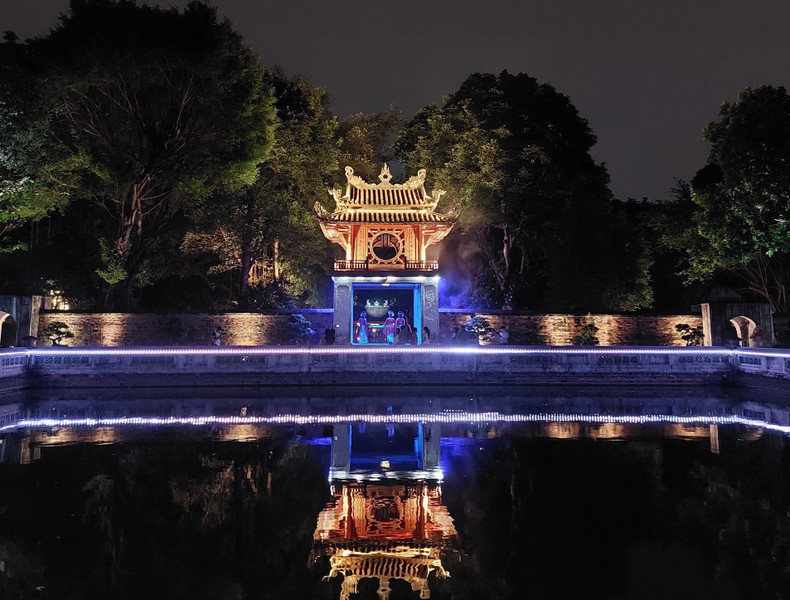 与白天游不同,夜游有其独特的魅力,游客不仅可以在神秘的夜晚中探索文庙-国子监遗址,还可以观赏绚丽多彩的灯光效果。除了照明系统的灯光为遗迹空间营造出神奇而璀璨的夜景外,参观者还可以观赏3D摄影技术的灯光秀。通过这些活动,游客可以了解越南尊师重道、重视人才的传统以及在君主专制的政权下建立的第一所大学建设发展历程。此外,游客还有机会体验虚拟眼镜产品,观看传统艺术表演等。