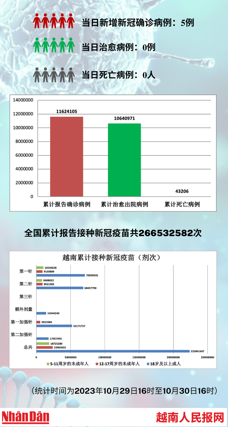 据越南卫生部10月30日下午公布的信息,当天越南新增新冠肺炎确诊病例为5例,治愈病例0,无死亡病例。