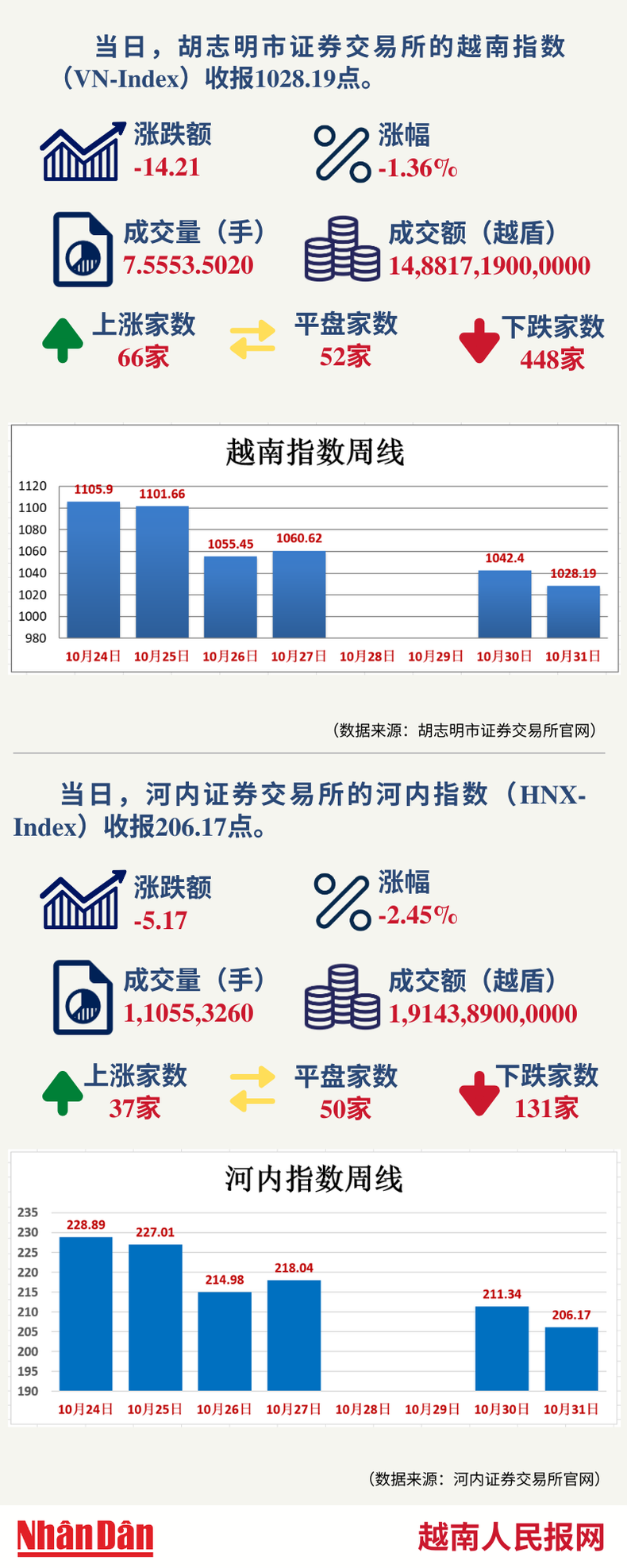 当天,胡志明市证券交易所的越南指数(VN-Index)和河内证券交易所的河内指数(HNX-Index)分别收报1028.19点和206.17点。