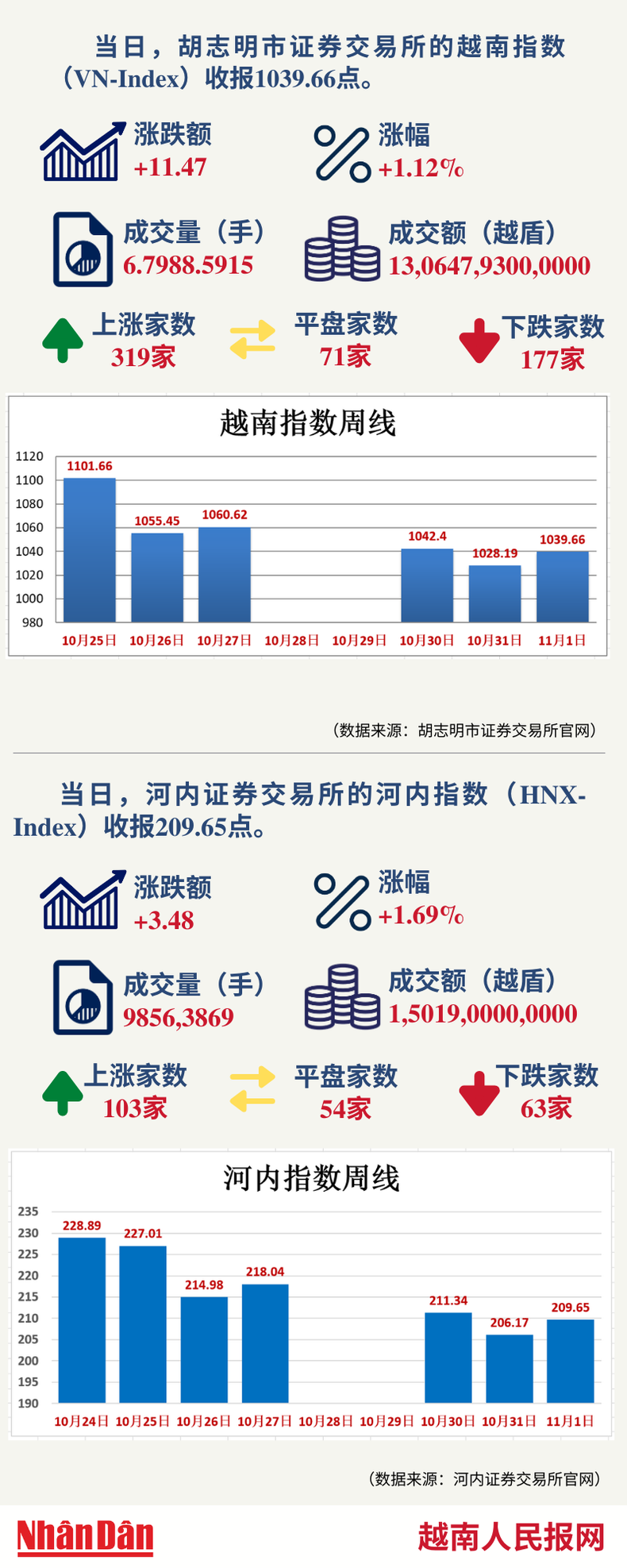 当天,胡志明市证券交易所的越南指数(VN-Index)和河内证券交易所的河内指数(HNX-Index)分别收报1039.66点和209.65点。