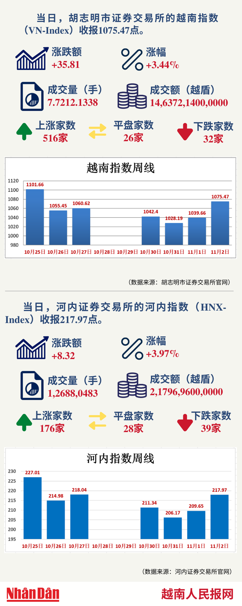 当天,胡志明市证券交易所的越南指数(VN-Index)和河内证券交易所的河内指数(HNX-Index)分别收报1075.47点和217.97点。