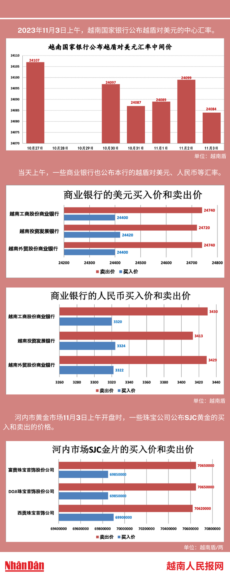 2023年11月3日上午,越南国家银行所公布的越盾对美元的中心汇率为24084。