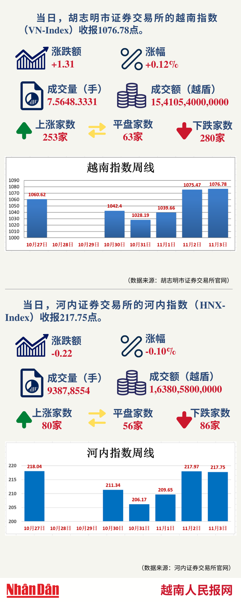 当天,胡志明市证券交易所的越南指数(VN-Index)和河内证券交易所的河内指数(HNX-Index)分别收报1076.78点和217.75点。