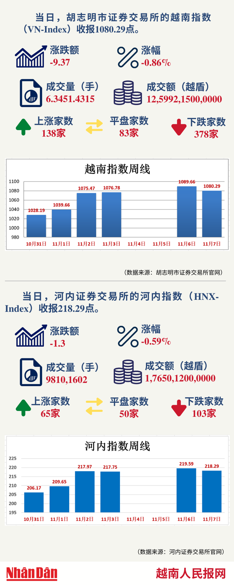 当天,胡志明市证券交易所的越南指数(VN-Index)和河内证券交易所的河内指数(HNX-Index)分别收报1080.29点和218.29点。