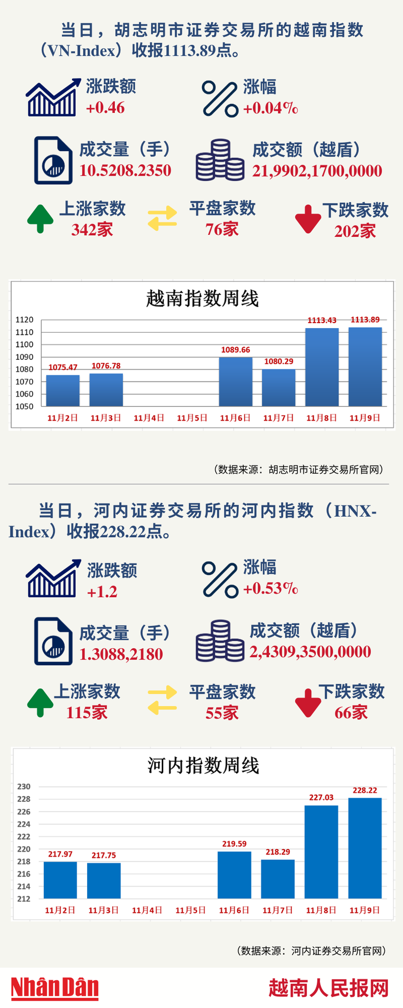 当天,胡志明市证券交易所的越南指数(VN-Index)和河内证券交易所的河内指数(HNX-Index)分别收报1113.89点和228.22点。