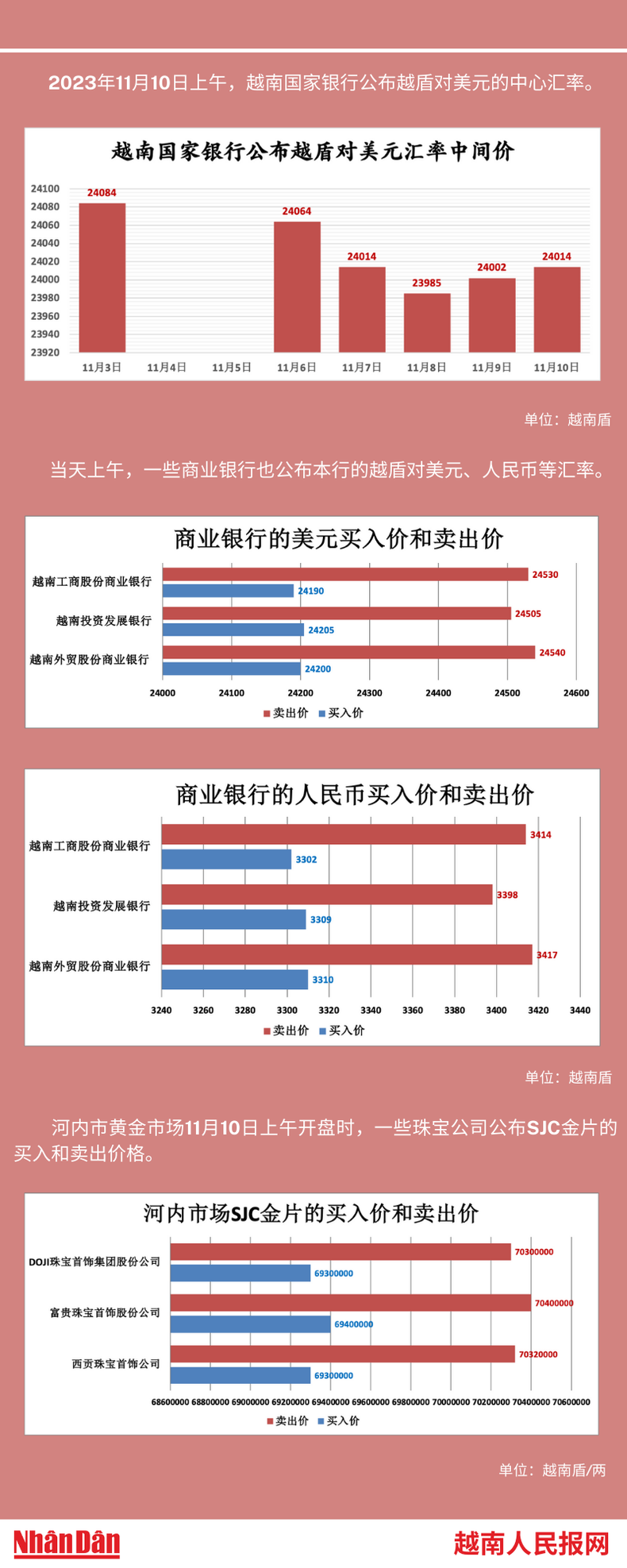 2023年11月10日上午,越南国家银行所公布的越盾对美元的中心汇率为24014。
